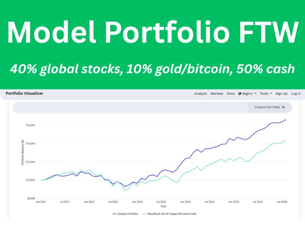 This model portfolio (40% global stocks, 10% gold/bitcoin, 50% cash) is designed to greatly reduce risk while maintaining some upside. Over the five year period from Jan 2021 to Jan 2026, it delivered higher returns, lower drawdown, and a better Sharpe ratio than the standard 60/40 benchmark.